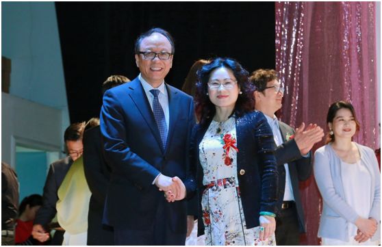 廖子蔚总裁和孔玮玮副领事长为荣获特等奖的Gemma Yin颁奖
