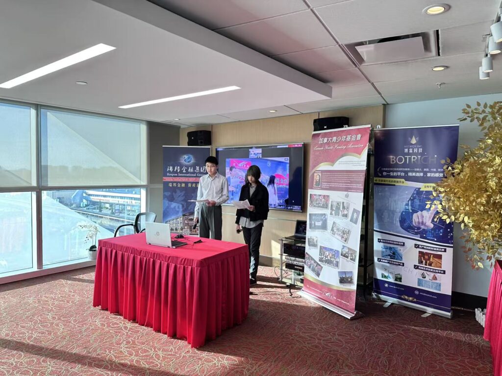 作为 CYFA 多年的坚定合作伙伴与本次赛事的常年赞助商,瑞邦资产管理公司不仅为多伦多主会场提供了专业场地支持,更持续以资源赋能青年创业生态建设。瑞邦金融总部位于多伦多,深耕家族财富传承、资产规划、税务策划等核心领域,始终秉持 “赋能成长,共创未来” 的理念,长期关注青少年教育与创业创新事业。活动现场,瑞邦金融代表 Crystal Jin 女士登台发表讲话。图片